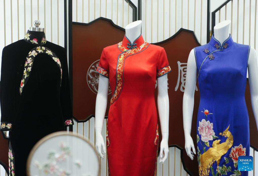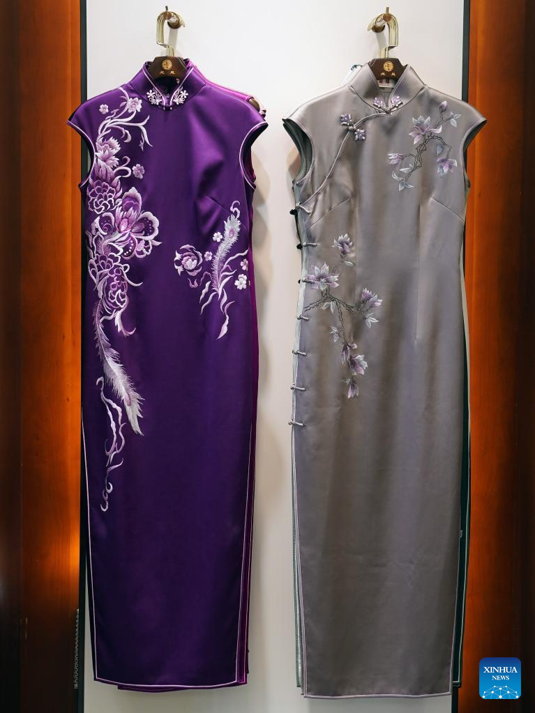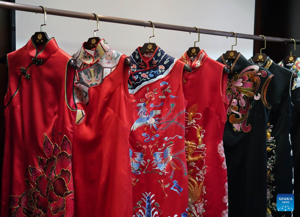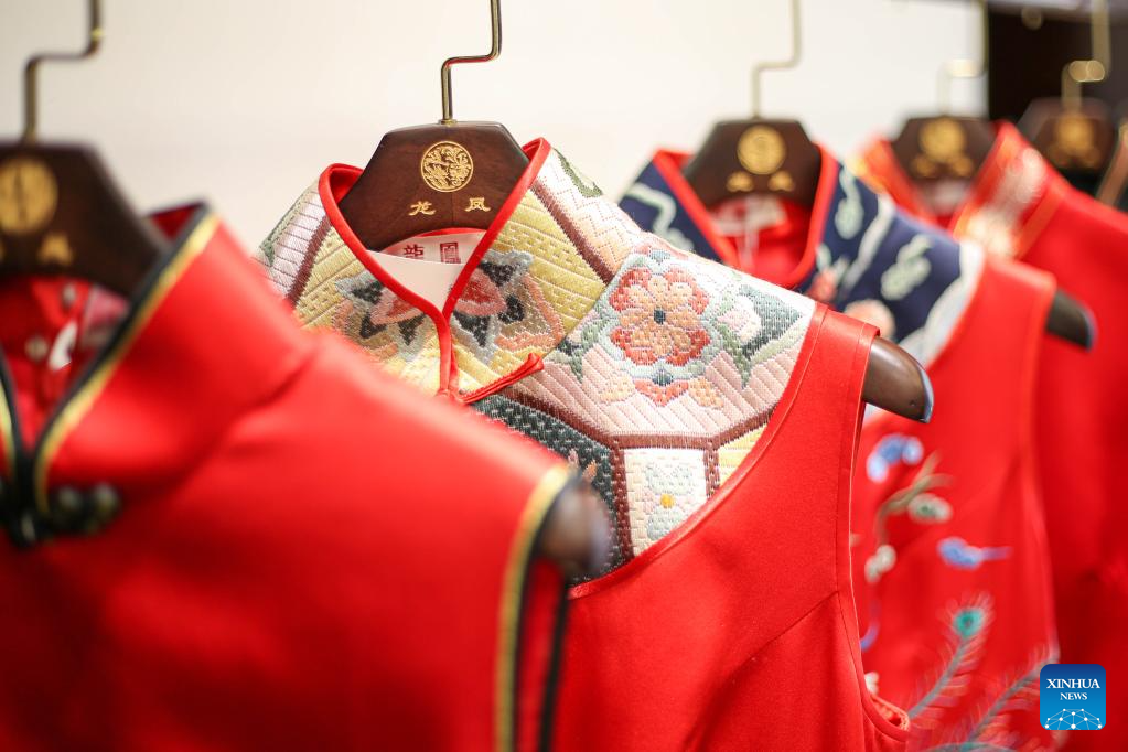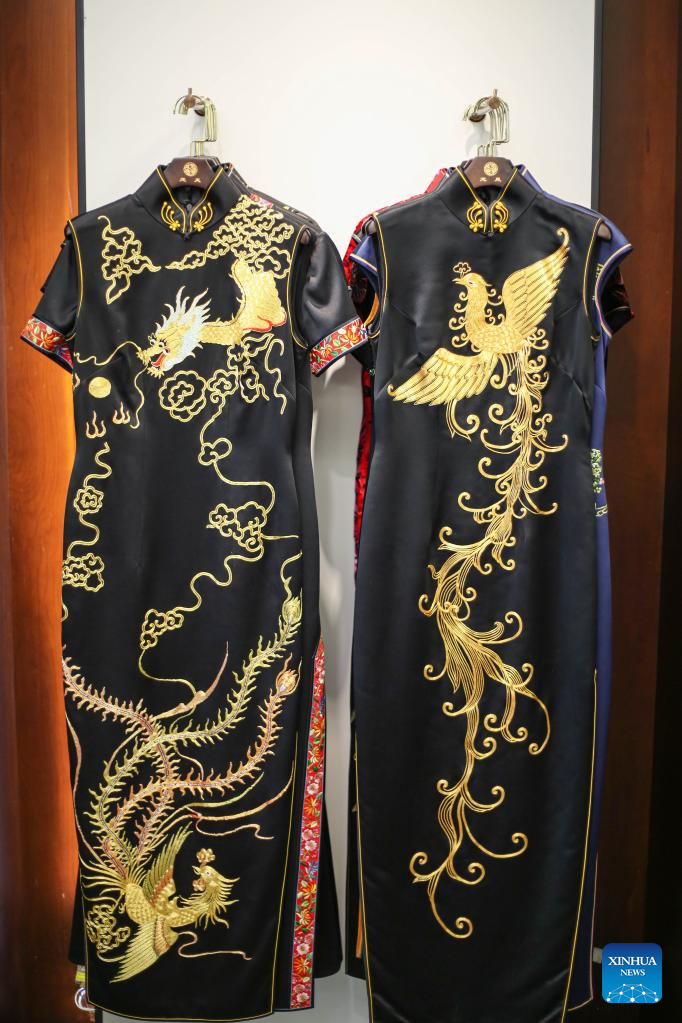 Cheongsams with dragon and phoenix patterns are seen at the Longfeng Cheongsam store in Shanghai, east China, May 30, 2023. (Xinhua/Xin Mengchen)