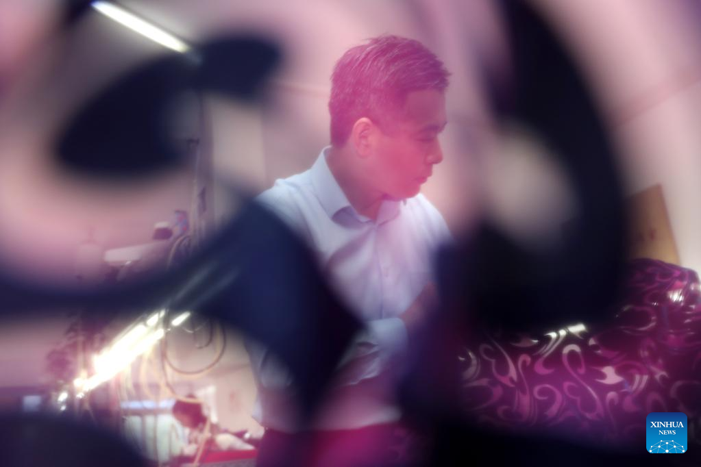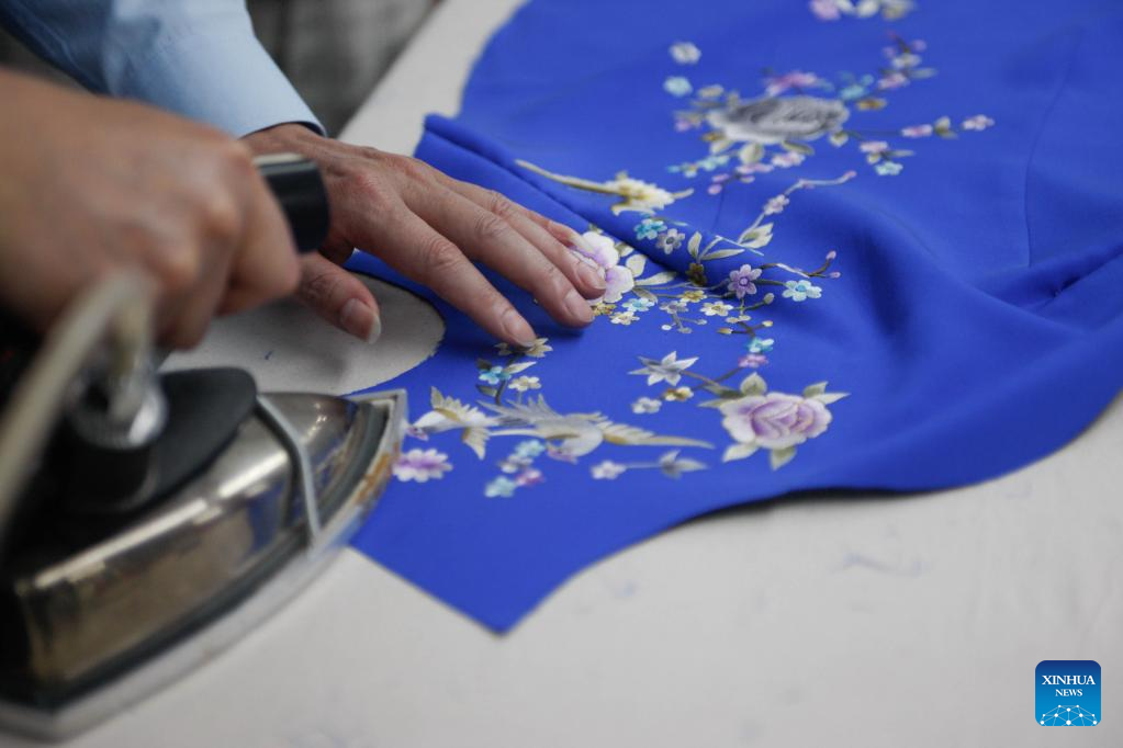 Jiang Manzong irons a piece of semi-finished cheongsam at a training institute for Longfeng Cheongsam in Shanghai, east China, May 31, 2023. (Xinhua/Zhu Weixi)