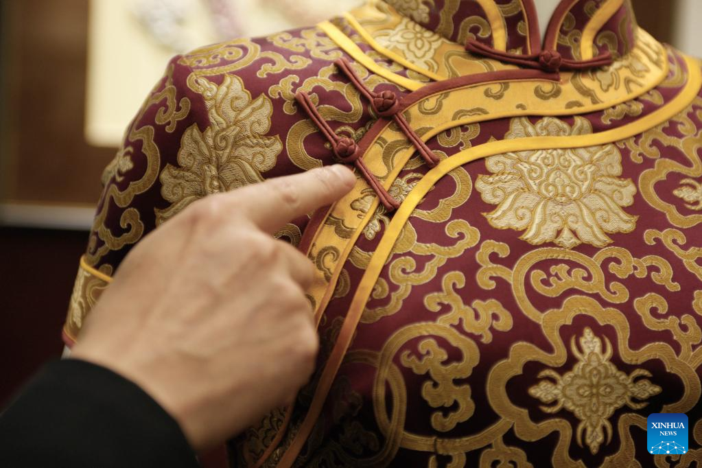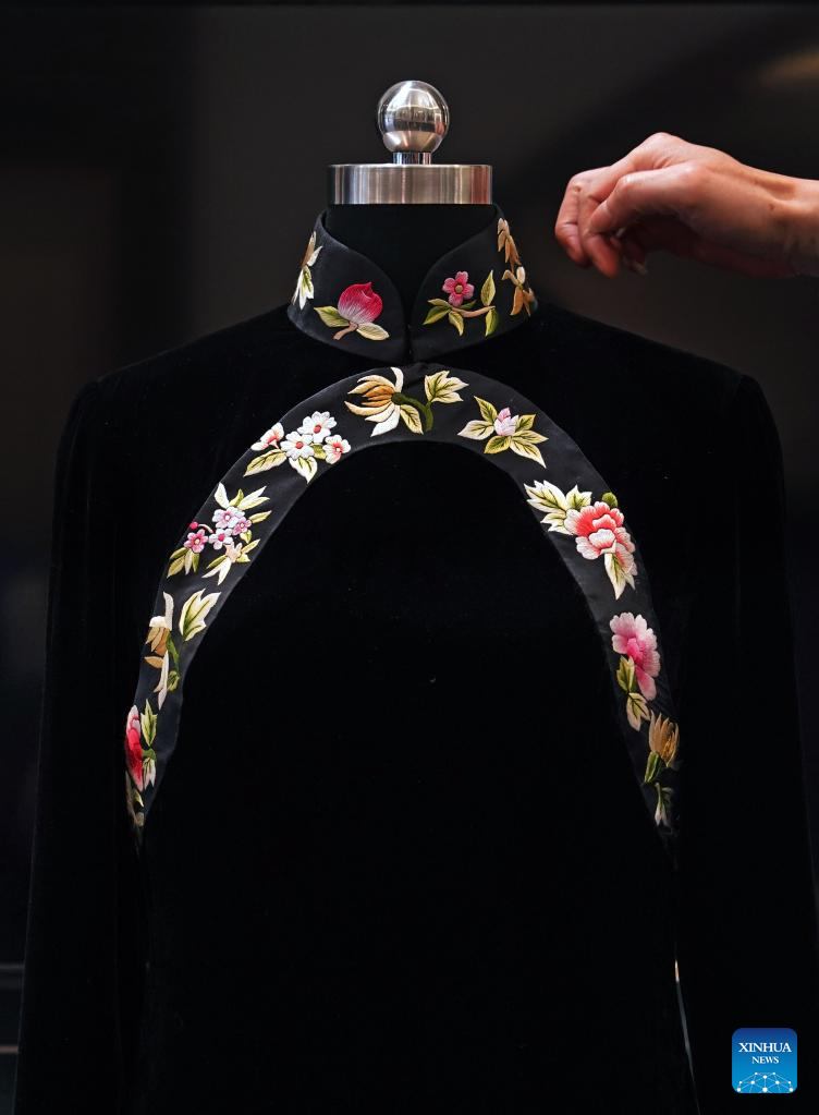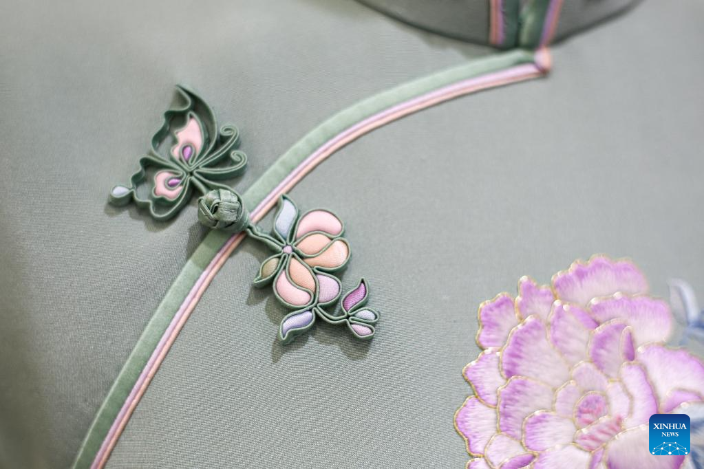 This photo taken on May 30, 2023 shows a Pankou (knot button) on a cheongsam at the Longfeng Cheongsam store in east China's Shanghai. (Xinhua/Wang Xiang)