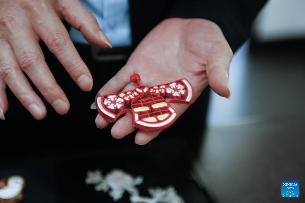 Jiang Manzong shows a Pankou (knot button) at the Longfeng Cheongsam store in Shanghai, east China, May 30, 2023. (Xinhua/Zhu Weixi)