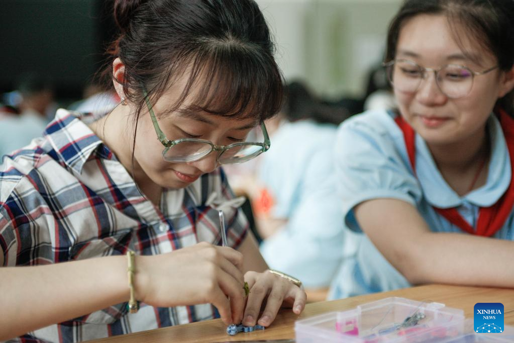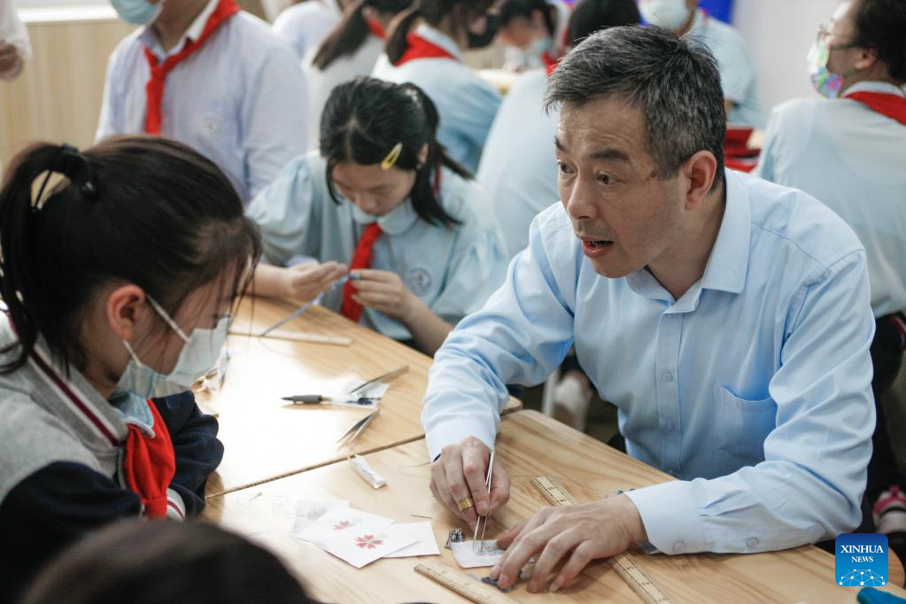 Zhang Qinwei (L), an apprentice of Jiang Manzong, teaches a student on making knot button at Qingyun Middle School in Shanghai, east China, May 30, 2023. (Xinhua/Zhu Weixi)