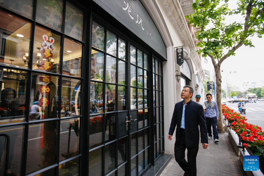 Jiang Manzong walks into the Longfeng Cheongsam store in east China's Shanghai, May 30, 2023. (Xinhua/Zhu Weixi)