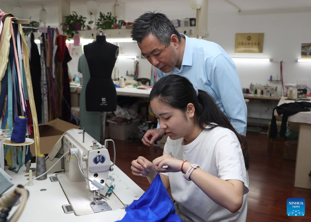 Jiang Manzong (back) guides his apprentice Wu Yuting at a training institute for Longfeng Cheongsam in Shanghai, east China, May 31, 2023. (Xinhua/Liu Ying)