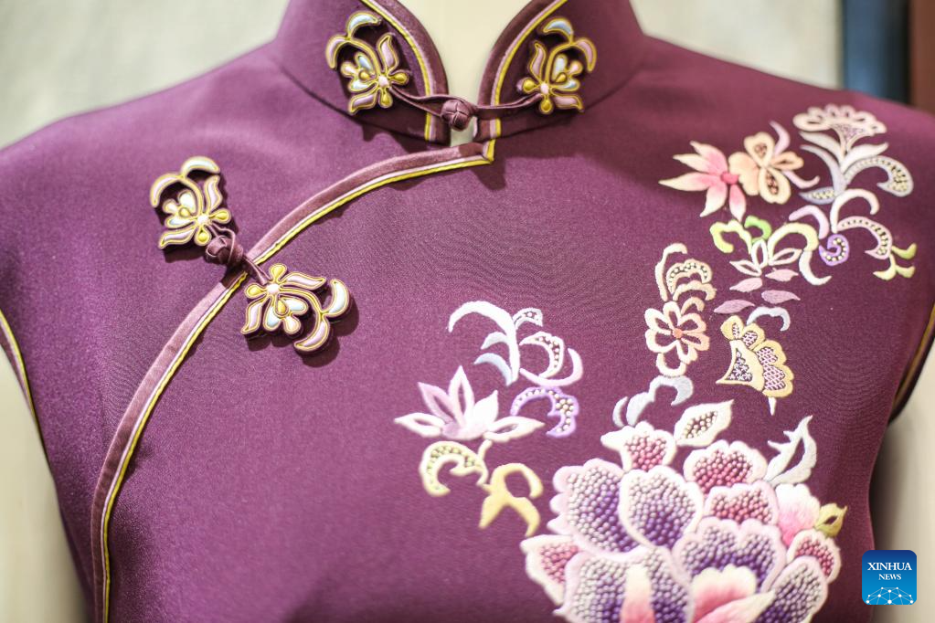 This photo taken on May 30, 2023 shows a cheongsam at the Longfeng Cheongsam store in east China's Shanghai. (Xinhua/Wang Xiang)