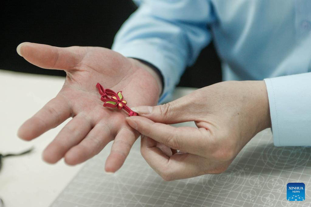Jiang Manzong shows a Pankou (knot button) at a training institute for Longfeng Cheongsam in Shanghai, east China, May 31, 2023. (Xinhua/Zhu Weixi)