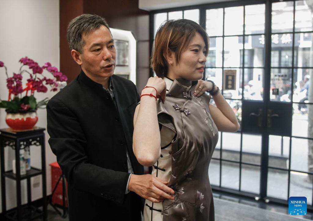 Jiang Manzong helps a customer to try on a cheongsam sample at a training institute for Longfeng Cheongsam in Shanghai, east China, May 31, 2023. (Xinhua/Xin Mengchen)