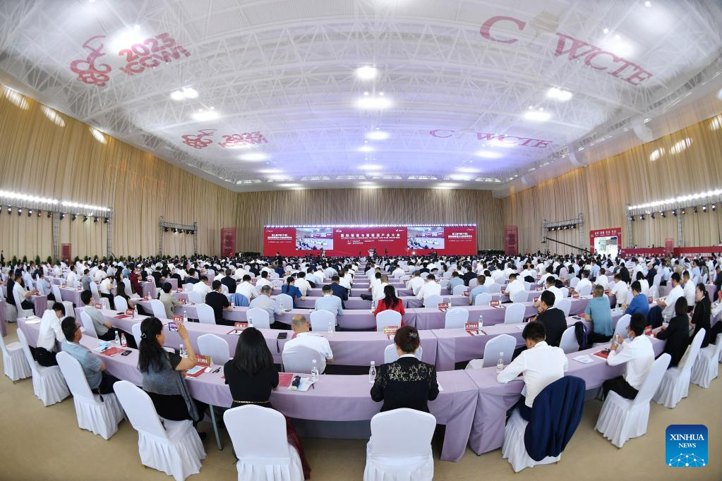 This photo taken on June 9, 2023 shows the opening ceremony of a wine-themed international conference and an expo in Yinchuan, northwest China's Ningxia Hui Autonomous Region.