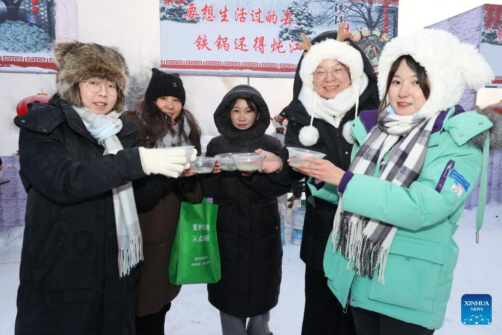 Tourists pose for photos with bowls of fish soup during a winter fishing event in Mohe, northeast China's Heilongjiang Province, Dec. 30, 2025. The event held on Tuesday showcased some customs and folk arts only found in Mohe. (Photo by Shao Tianli/Xinhua)