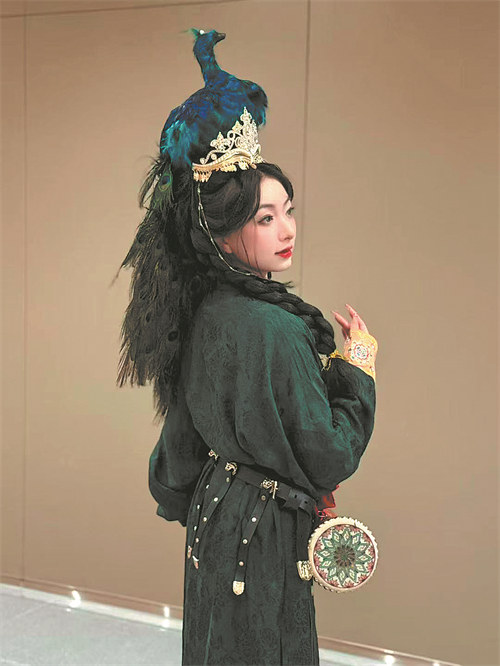 This female model is dressed in a round-neck, narrow-sleeved robe and a waist drum. The attire aims to recreate the scene of Tang Dynasty (618-907)-era women drumming on horseback. She is also wearing an elaborate peacock crown. The peacock, with its head held high, features feathers in shades of sky blue, light green, red, and black, with a white downy neck and tail feathers draping the woman's shoulders. The peacock is modeled on a female equestrian drummer figurine, housed in the Xi'an Museum.