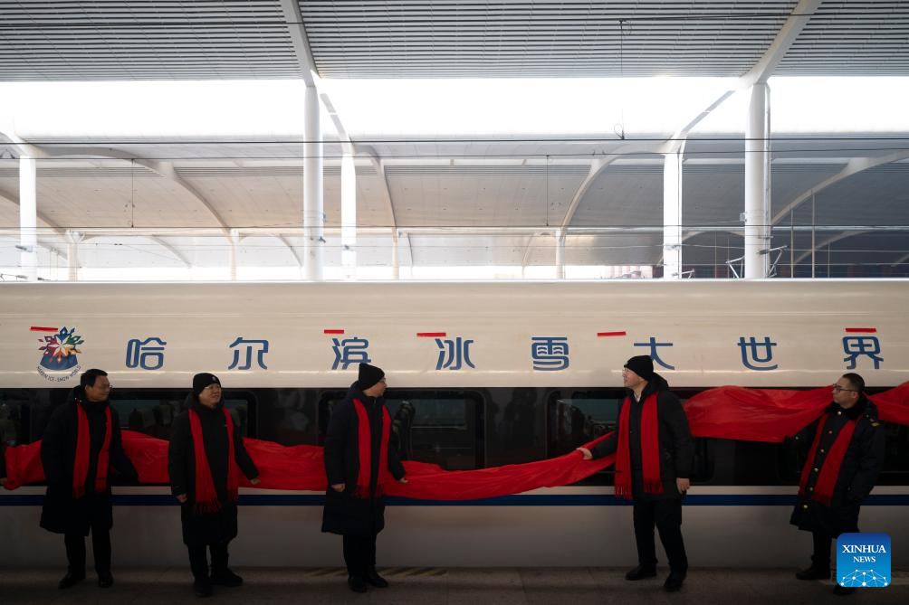This photo taken on Jan. 4, 2026 shows the unveiling ceremony of the bullet train No.G1276, the first themed high-speed train of the Harbin Ice-Snow World, at Harbin West Station in Harbin, northeast China's Heilongjiang Province. The first high-speed train with the theme of the Harbin Ice-Snow World began service from Harbin West Station on Sunday, heading for Wuhan City in central China's Hubei Province. Featuring unique interior and exterior decorations of the Harbin Ice-Snow World, the themed high-speed train serves as a mobile emblem to boost the ice and snow economy. (Xinhua/Zhang Tao)