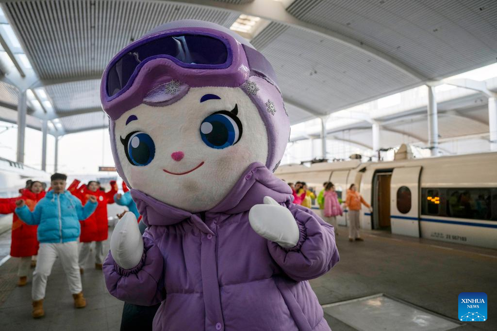 The bullet train No.G1276, the first themed high-speed train of the Harbin Ice-Snow World, departs from Harbin West Station in Harbin, northeast China's Heilongjiang Province, Jan. 4, 2026. The first high-speed train with the theme of the Harbin Ice-Snow World began service from Harbin West Station on Sunday, heading for Wuhan City in central China's Hubei Province. Featuring unique interior and exterior decorations of the Harbin Ice-Snow World, the themed high-speed train serves as a mobile emblem to boost the ice and snow economy. (Photo by Liu Yang/Xinhua)