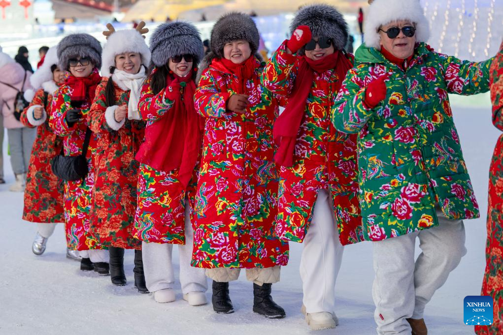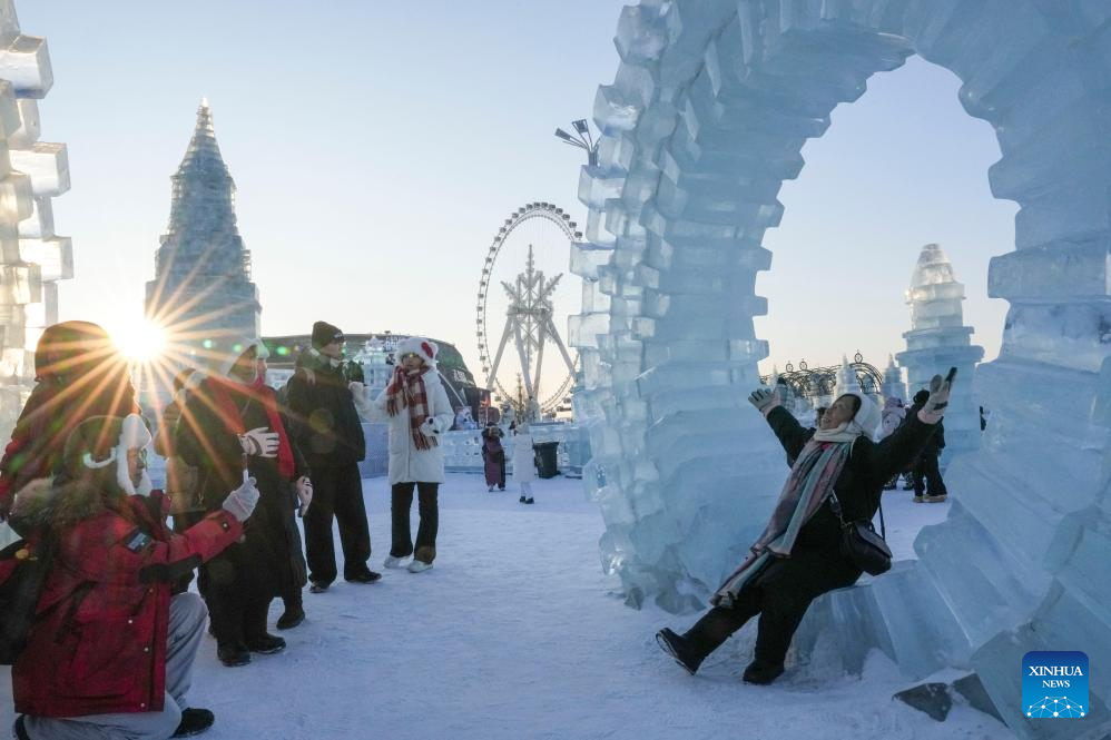 Visitors pose for photos at the Harbin Ice-Snow World in Harbin, northeast China's Heilongjiang Province, Jan. 5, 2026. The 42nd Harbin International Ice and Snow Festival kicked off at the Harbin Ice-Snow World here on Monday. (Xinhua/Wang Jianwei)