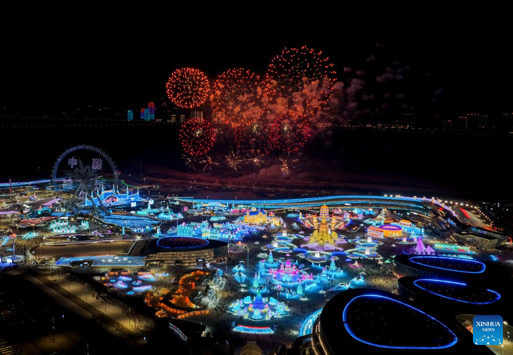 An aerial drone photo taken on Jan. 5, 2026 shows a firework show at the Harbin Ice-Snow World in Harbin, northeast China's Heilongjiang Province. The 42nd Harbin International Ice and Snow Festival kicked off at the Harbin Ice-Snow World here on Monday. (Xinhua/Wang Song)