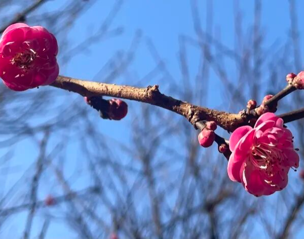 One visitor said, “I come to the exhibition several times every year to enjoy the plum blossoms. This season, the wintersweet is in bloom, and to my surprise, the red plum blossoms have also begun to flower. Seeing the blossoms always puts me in a great mood.” Another visitor noted that the potted plum blossoms near the park entrance are currently at their best, while the plum groves in the mountainous areas are expected to take another 20 days or so to fully bloom.