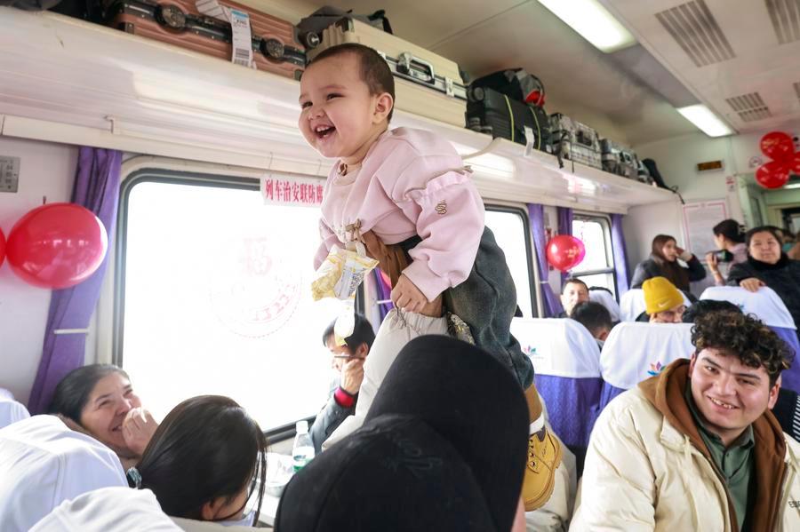 A passenger plays with a child on the train No. 7557 from Urumqi to Hotan Prefecture in northwest China's Xinjiang Uygur Autonomous Region, Jan. 2, 2025. (Xinhua/Wang Fei)