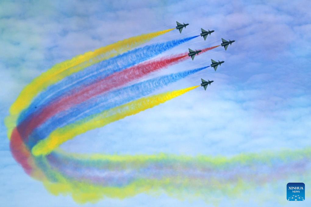 Aircraft of the Bayi Aerobatic Team of the Chinese People's Liberation Army (PLA) Air Force perform during the 10th Singapore Airshow in Singapore, Feb. 4, 2026. The 10th Singapore Airshow opened on Tuesday at the Changi Exhibition Center. The airshow runs until Feb. 8, with the Bayi Aerobatic Team of the Chinese People's Liberation Army (PLA) Air Force delivering flight displays. (Photo by Zhu Jianghai/Xinhua)