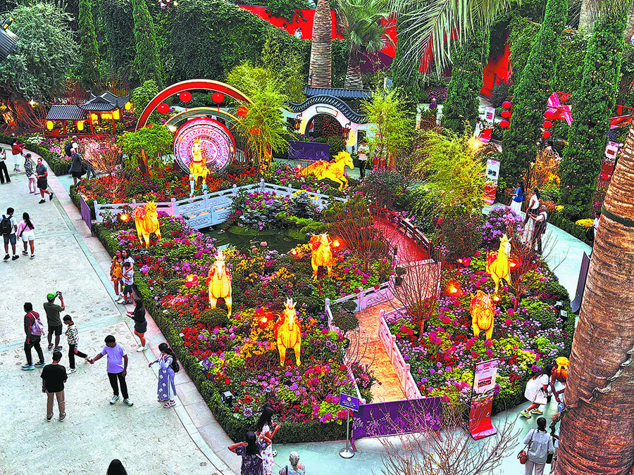 Beyond the vibrant seasonal blooms, the floral display intricately weaves Jiangnan garden elegance with auspicious themes for the Year of the Horse, according to the design team. Inspired by the ancient Chinese painting Eight Horses, the scene "dancing horses among flowers" features horse lanterns crafted using the traditional lantern-making technique from Zigong city, Sichuan province, whose lantern festival was inscribed as a national-level intangible cultural heritage.