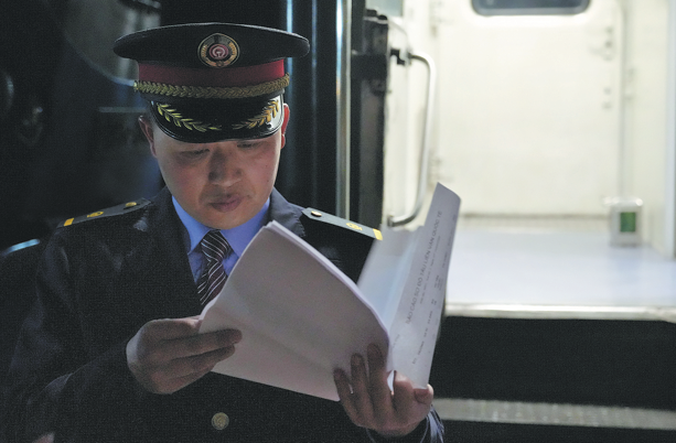 Train conductor Huang Junjie makes preparations before departure in Hanoi on Feb 10. XINHUA