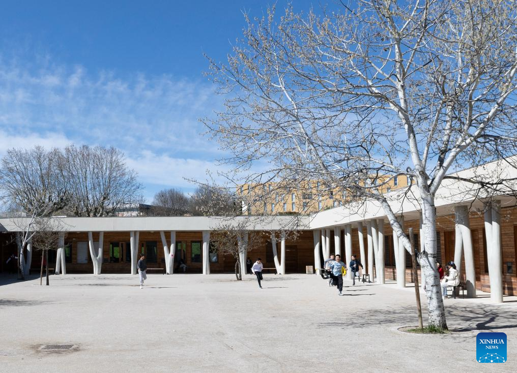 Students run on campus at the Provence-Alpes-Cote d'Azur International School in Manosque, France, March 12, 2026. Chinese President Xi Jinping recently replied to a letter from teachers and students of the Chinese language class at the Provence-Alpes-Cote d'Azur International School in France, extending his best wishes to them as well as all the teachers and students of the school. (Xinhua/Wu Huiwo)