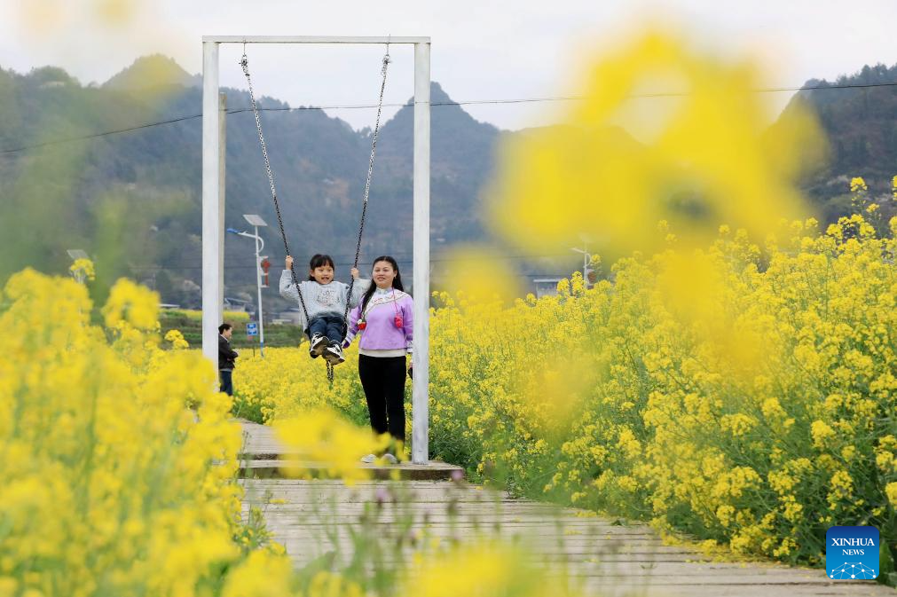A child enjoys swing at Shangwengshao Village in Qiandongnan Miao and Dong Autonomous Prefecture, southwest China's Guizhou Province, March 21, 2026. People step outdoors and embrace nature as spring unfolds across China. (Photo by Tai Shengzhi/Xinhua)