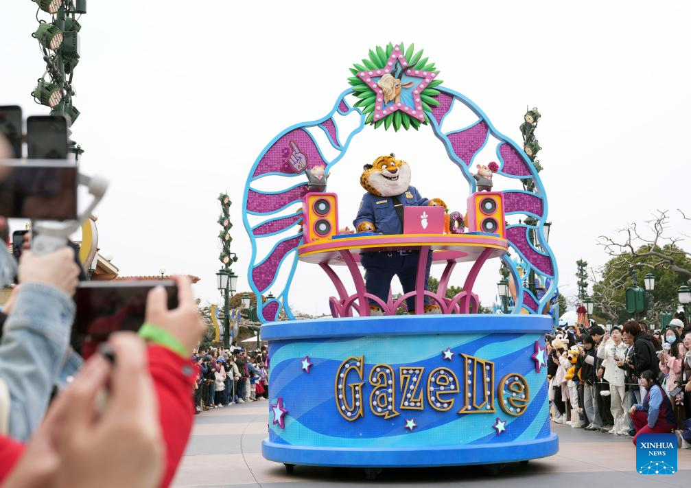 A float is seen during a parade at the Shanghai Disneyland in Shanghai, east China, March 20, 2026. A series of celebrations designed for the 10th anniversary of the opening of Shanghai Disneyland started here on Friday. The Shanghai Disneyland opened here on June 16, 2016. (Xinhua/Liu Ying)