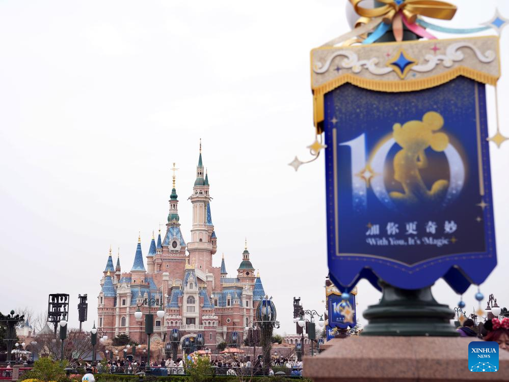 A poster themed on 10th anniversary is seen at the Shanghai Disneyland in Shanghai, east China, March 20, 2026. A series of celebrations designed for the 10th anniversary of the opening of Shanghai Disneyland started here on Friday. The Shanghai Disneyland opened here on June 16, 2016. (Xinhua/Liu Ying)