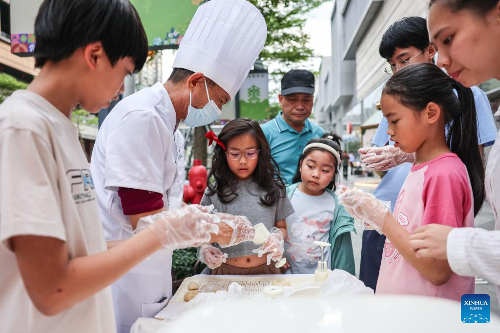 People experience making Hainan-style mooncakes at a market featuring intangible cultural heritage activities in Haikou, south China's Hainan Province, March 21, 2026. The market was held here from March 20 to 22, showcasing the charm of intangible cultural heritage. (Xinhua/Zhang Liyun)