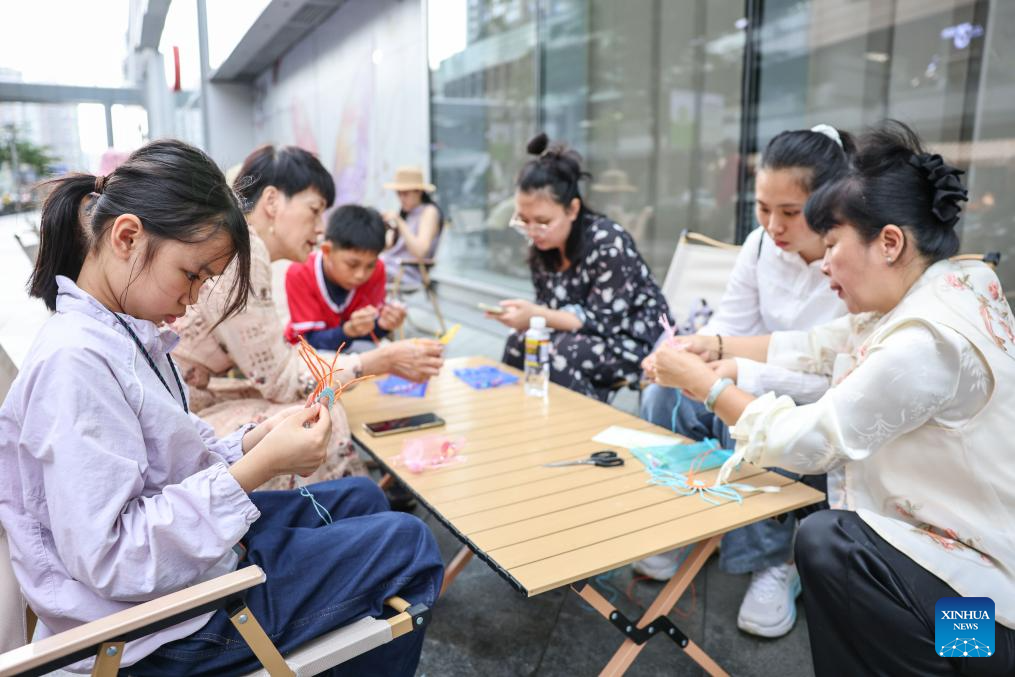 People experience straw-weaving at a market featuring intangible cultural heritage activities in Haikou, south China's Hainan Province, March 21, 2026. The market was held here from March 20 to 22, showcasing the charm of intangible cultural heritage. (Xinhua/Zhang Liyun)