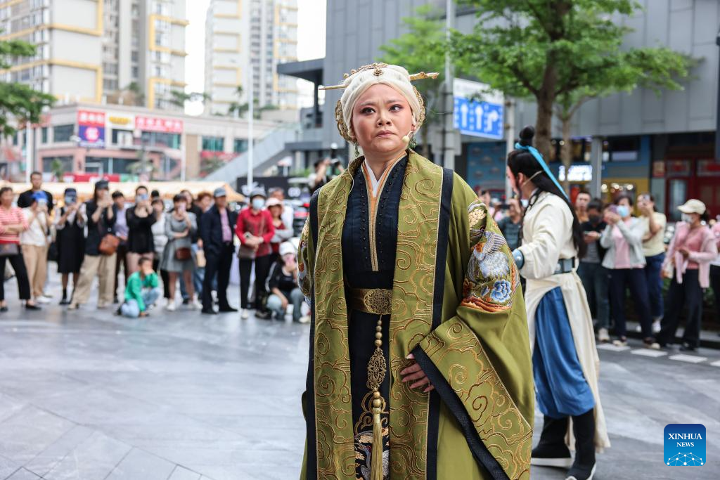 An artist stages a performance at a market featuring intangible cultural heritage activities in Haikou, south China's Hainan Province, March 21, 2026. The market was held here from March 20 to 22, showcasing the charm of intangible cultural heritage. (Xinhua/Zhang Liyun)