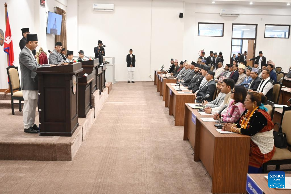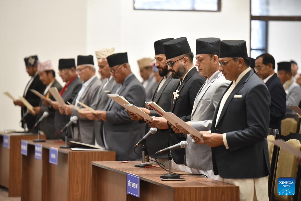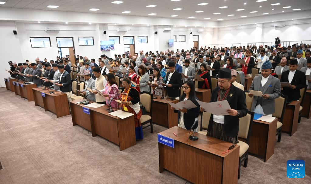 Lawmakers of the newly elected House of Representatives of Nepal take the oath of office and secrecy at a ceremony at the main administrative complex Singha Durbar in Kathmandu, Nepal, March 26, 2026. The oath-taking ceremony marks the formal beginning of the new parliamentary term. (Photojournalist Club Nepal/Handout via Xinhua)