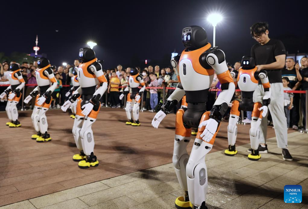 Robots dance in Fuzhou, southeast China's Fujian Province, April 19, 2026. A robot dance performance was staged here to welcome the 9th Digital China Summit, which will convene in Fuzhou from April 29 to 30. (Xinhua/Jiang Kehong)