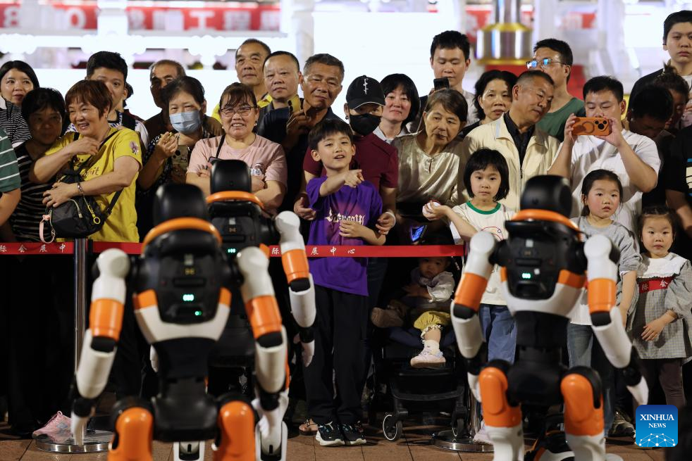 People watch a robot dance performance in Fuzhou, southeast China's Fujian Province, April 19, 2026. A robot dance performance was staged here to welcome the 9th Digital China Summit, which will convene in Fuzhou from April 29 to 30. (Xinhua/Jiang Kehong)