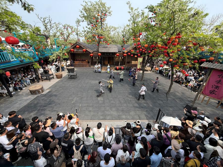 Tourists have fun at the Wansuishan Martial Arts City in Kaifeng, central China's Henan Province, April 17, 2026. (Xinhua/Ren Zhuoru)