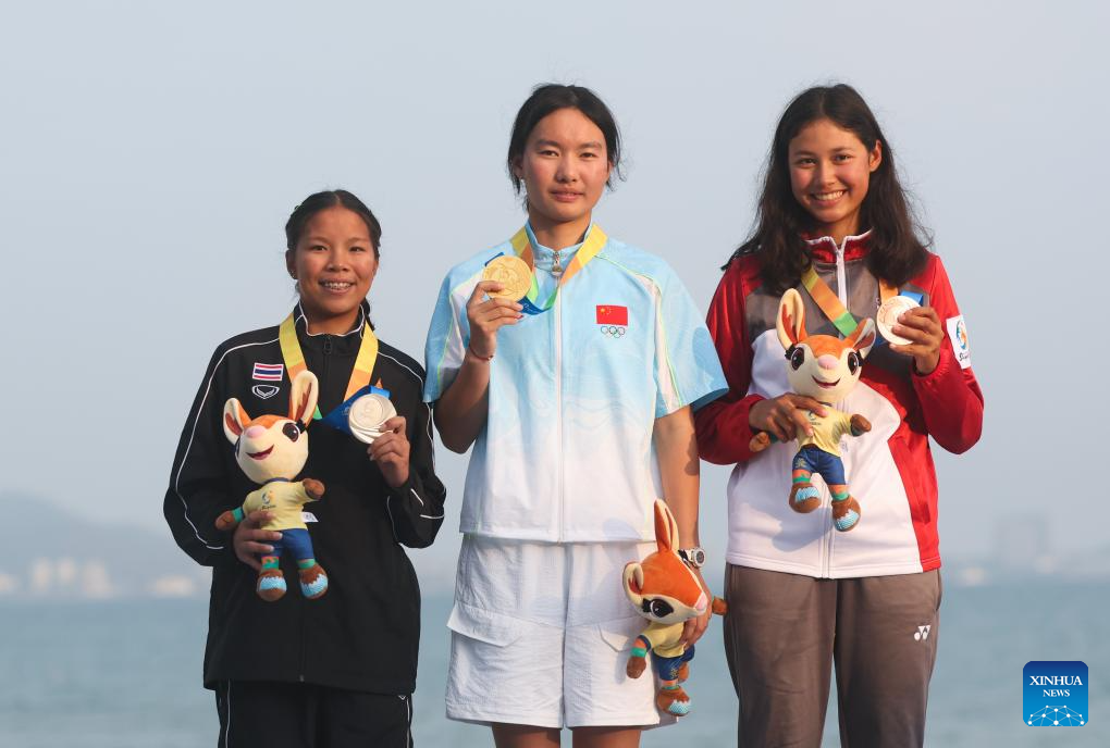 Gold medalist Yan Guoguo (C) of China, silver Medalist Pailin Jaroenpon (L) of Thailand and bronze medalist Nia Mehry Zahedi of Singapore attend the awarding ceremony for the ILCA4 Girls race of sailing at the 6th Asian Beach Games in Sanya, south China's Hainan Province, April 28, 2026. (Xinhua/Zhang Fan)