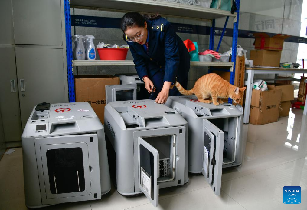 A staff member organizes smart pet transport cases at Guiyang North Railway Station in Guiyang, southwest China's Guizhou Province, April 29, 2026. Ahead of the May Day holiday, demand for the newly introduced high-speed railway pet consignment services has surged. Railway operators nationwide are undertaking comprehensive service procedure optimizations and upgrades to the smart pet transport cases, ensuring strict physical separation between pets and passengers throughout the journey.