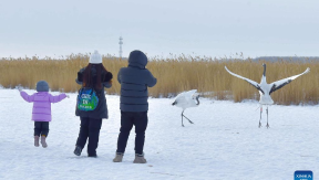 People watch red-crowned cranes at the snow covered Zhalong National Nature Reserve in Qiqihar, northeast China's Heilongjiang Province, Dec. 22, 2024. The artificial-bred red-crowned cranes at Zhalong National Nature Reserve have become a tourist attraction i...