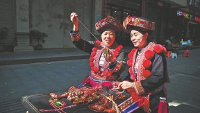 Pan Haiyan demonstrates needlework technique to an apprentice, talks with embroiderers and carries a bundle of fabrics (below left) at her embroidery workshop in Tianlin county, Baise city, Guangxi Zhuang autonomous region. The embroidery art of the Yao ethnic...