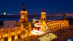An aerial drone photo taken on Dec. 17, 2024 shows a giant snowman in Harbin, northeast China's Heilongjiang Province.