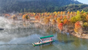 An aerial drone photo taken on Nov. 7, 2024 shows tourists viewing bald cypress forests on a sightseeing raft at a wetland park in Fangtang Township of Ningguo City, east China's Anhui Province.
