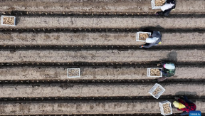A drone photo taken on March 26, 2026 shows farmers planting ginger in the fields of Daxinzhuang Town of Fengnan district, Tangshan, north China's Hebei Province. Spring farming is in full swing in Fengnan as the weather warms up.