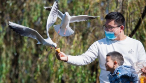 People view black-headed gulls at Cuihu Park in Kunming, southwest China's Yunnan Province.