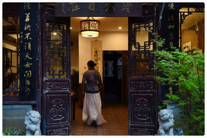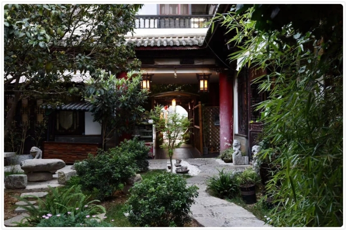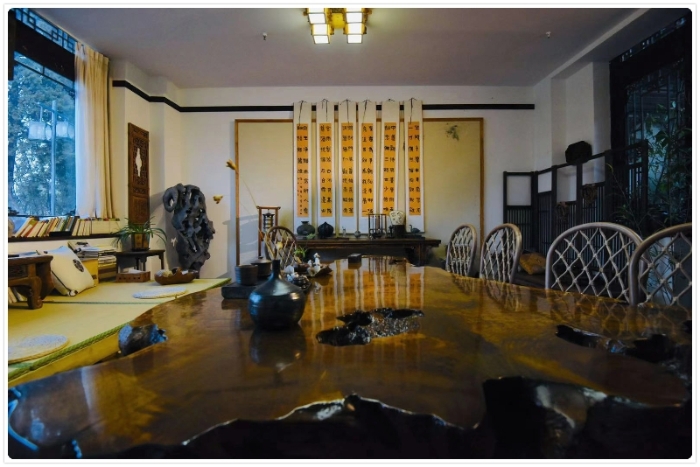 除了客房走廊里琳琅满目的文物古玩,让王玫梅最为得意的就是一楼的“引贤居”和一方小院。“引闲居”是王玫梅用来招待贵客的地方,云园致力于推崇非遗中的非凡、工匠中的名匠,在这里便可见一斑。中间是一张巨大的不规则型黄金樟桌子,进门左手边是一席清代红豆杉贵妃榻,榻后悬挂着二十四孝图文的木吉子,墙面上挂着云南本地书法家的墨宝,墙角摆着四大名石之一的太湖石,窗台旁边放着从英国拍回来的清代绿釉象耳瓶。