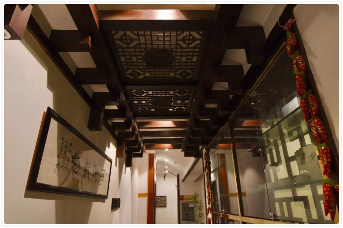 在二楼的走廊墙壁上,到处悬挂着诗词字画、木质窗棂,仔细一看,竟然都是几百甚至上千年前的大家之作。走廊中间有一面很大的玻璃柜,里面摆放着诸多茶盏、瓶子等古代小玩意儿。