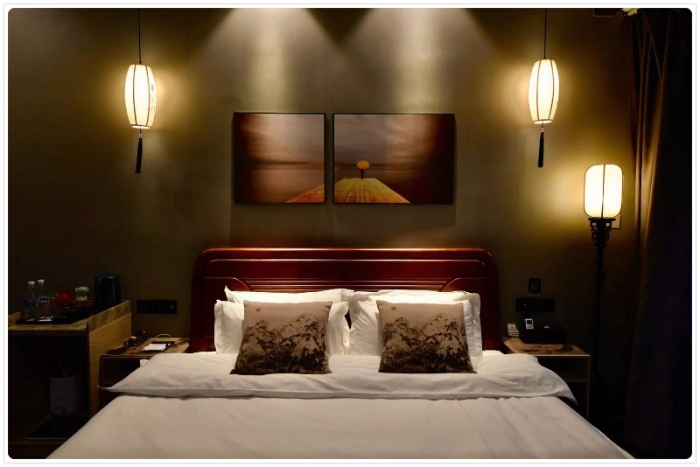 二楼就是客房。房间以沉静的棕褐色、褐红色和纯白色为主色调,雕梁绣户精致儒雅。干净整洁的白色大床,柔软而宽敞,让人忍不住想要躺在床上打个滚。不同品类的酒店房间有不同的窗外美景,但无论哪扇窗,外面的风景都是一绝。特别值得一提的是湖景雅奢大床房,硕大的雕窗沿着横梁围成了两面墙壁,光线透过窗户,衬得房间格外明亮。坐在松软的大床上,不管从侧面还是正对面都能看到,湛蓝的天空里云卷云舒,微风拂过水面,惹得湖水泛起一圈又一圈的金色波纹。