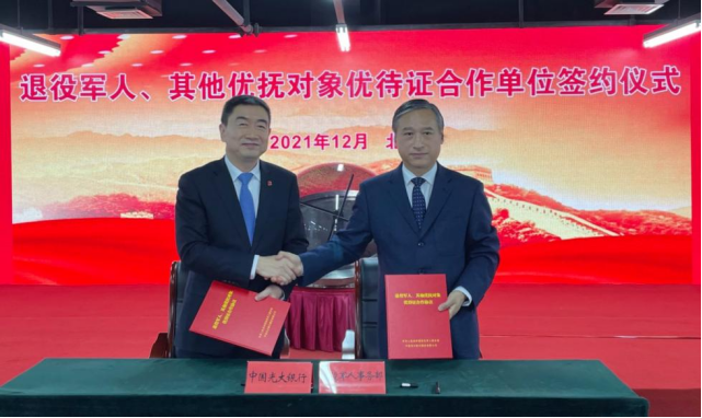 昆明信息港讯 近日,中国光大银行作为唯一一家股份制商业银行参加退役军人事务部举办的“退役军人、其他优抚对象优待证(以下简称“优待证”)申领”启动仪式,并作为首批合作银行与退役军人事务部签署《退役军人、其他优抚对象优待证合作协议》。