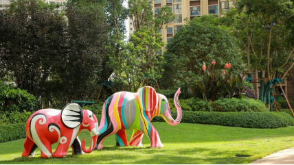 步行在春城上苑,满满的绿意和清凉扑面而来,考虑到昆明西北新城的周边环境,景观团队在绿化方面采用部分属地化乔木来组团造景,既本地化又有亲切感。而当时为应景COP15第一阶段大会的召开,设计师和团队就把小区里原计划的小鹿,换成了彩象,象征着七彩云南和生态和谐。今天和家长一起来到这里的孩子们,都忍不住上前去摸一摸这些彩色大象。