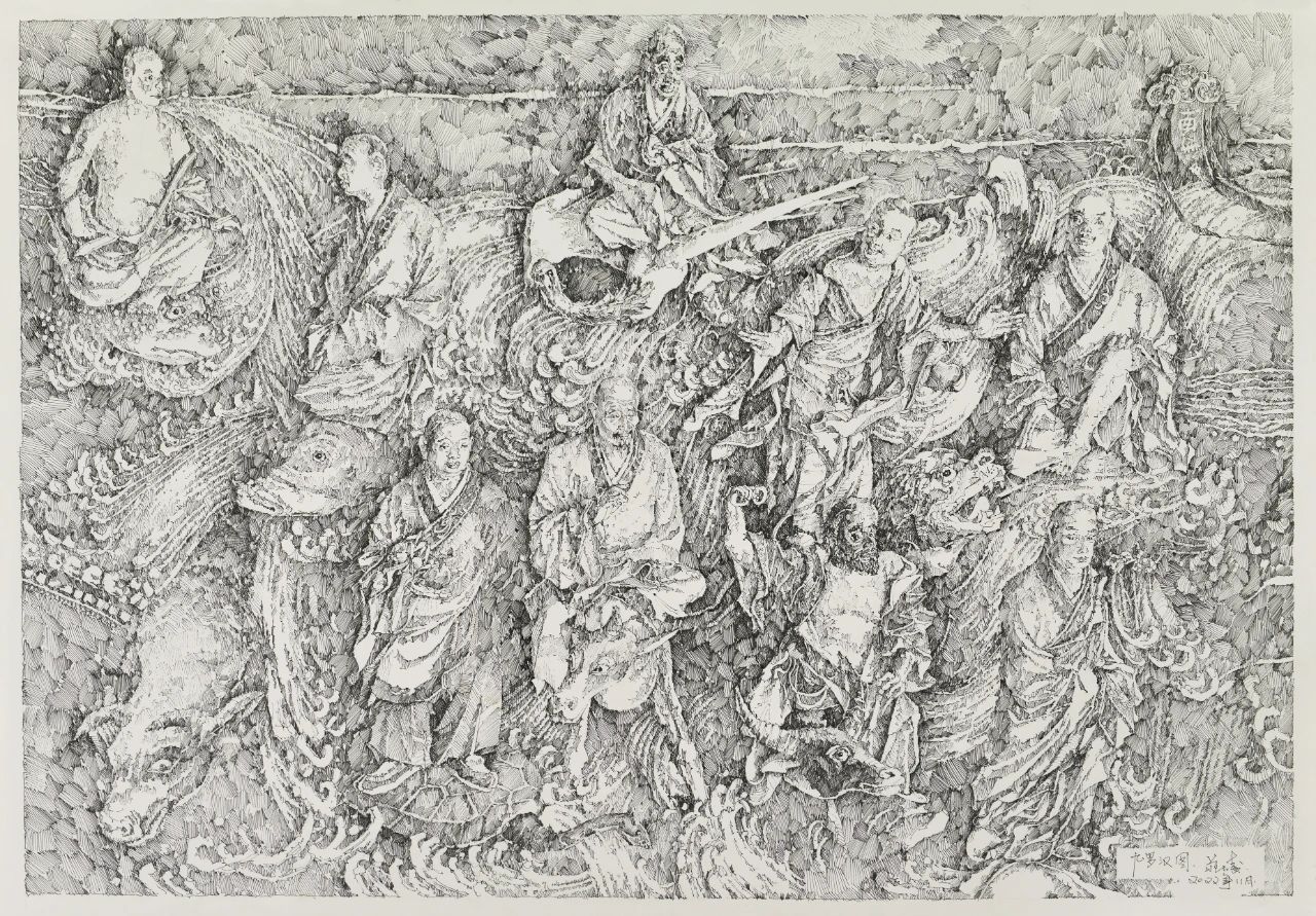 蒋凌 《九罗汉图》 钢笔画 76cmX52cm