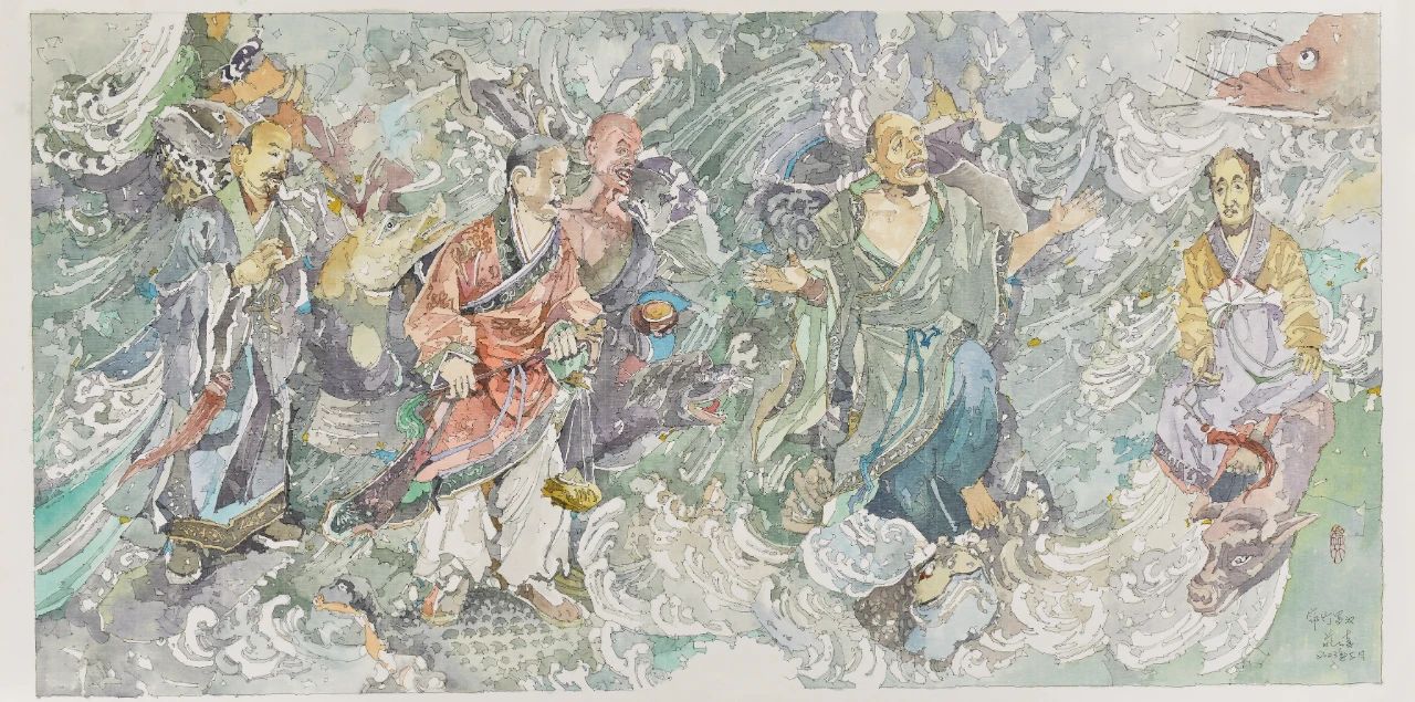蒋凌 《筇竹罗汉》 钢笔淡彩 47cmX93cm