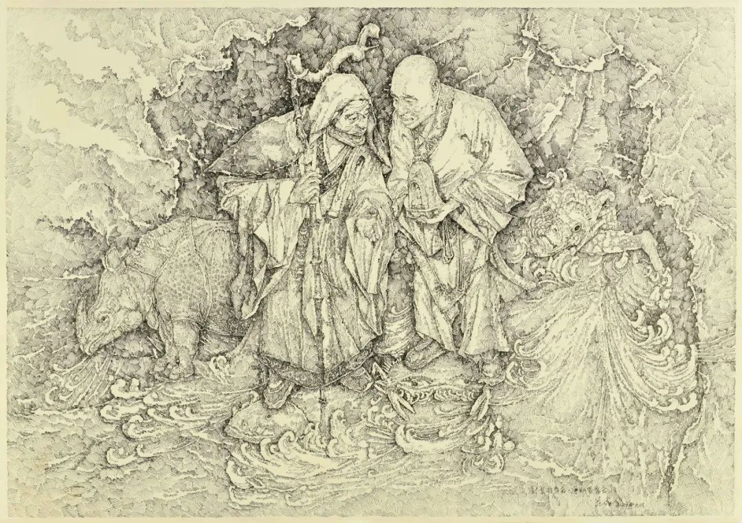 蒋凌 《澍云雨、净那罗 两尊者》 钢笔画 75cmX107cm