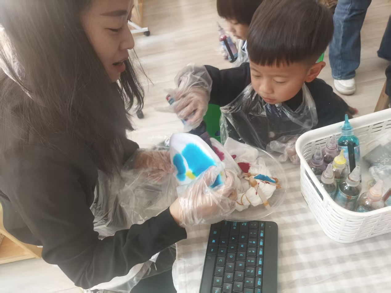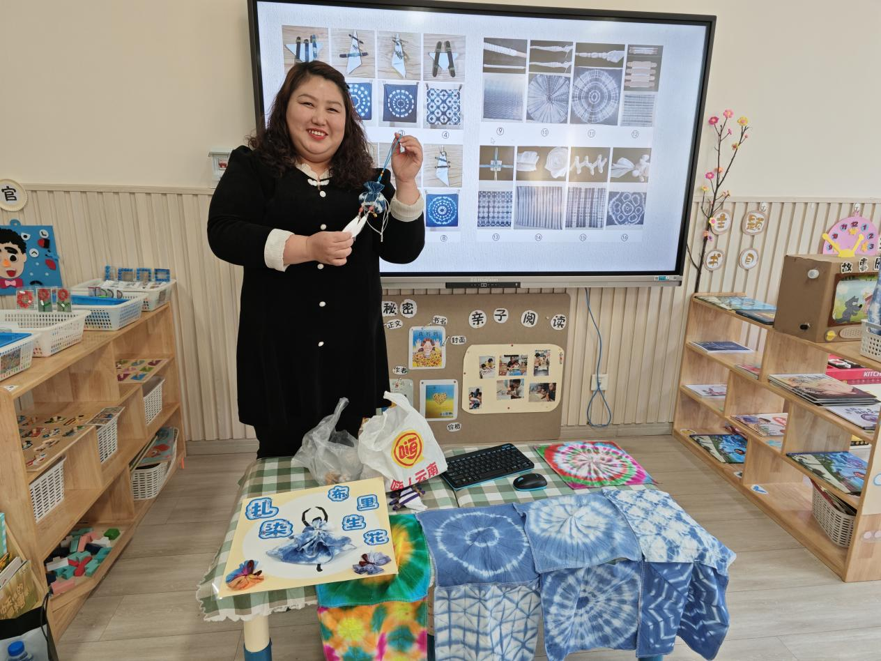 此次活动特别邀请了具有丰富的扎染知识和实践经验的诺涵妈妈作为嘉宾,诺涵妈妈向幼儿园师生及家长详细介绍了扎染的历史渊源和操作步骤。在示范环节,诺涵妈妈手法娴熟,依次展示了折叠、捆扎、染色等关键流程。随着鲜艳的染料在白布上慢慢晕染开来,呈现出奇妙而独特的图案,孩子们被这神奇的变化深深吸引,现场不时发出阵阵惊叹,对扎染艺术的创作热情也被充分点燃。